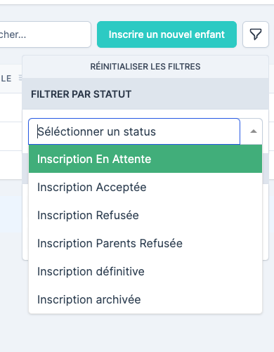 Il s’agit de la liste de toutes les demandes en attente, c'est-à-dire toutes les inscriptions en cours. Par défaut cette liste affiche toutes les inscriptions dont le statut est soit “En attente” ou “Accepté”. En utilisant le filtre, vous pouvez cependant afficher d’autres inscriptions, même les définitives et les archivées.