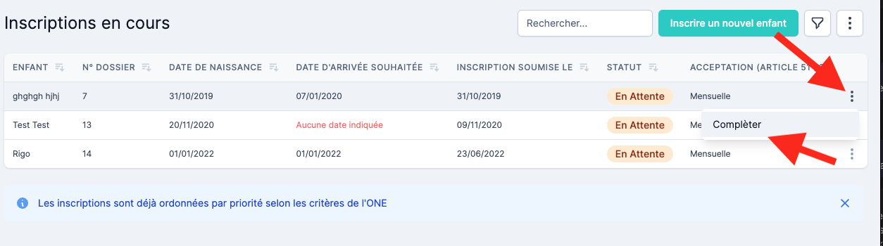 Chaque inscription en attente doit être complétée, ce processus est divisé en étapes: