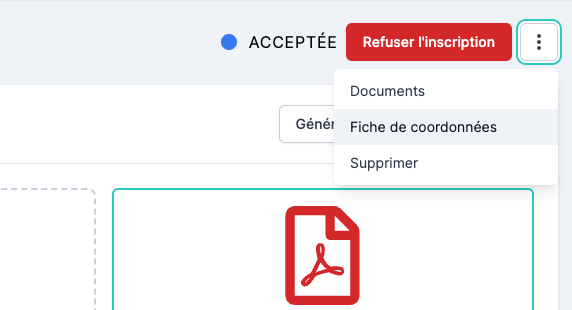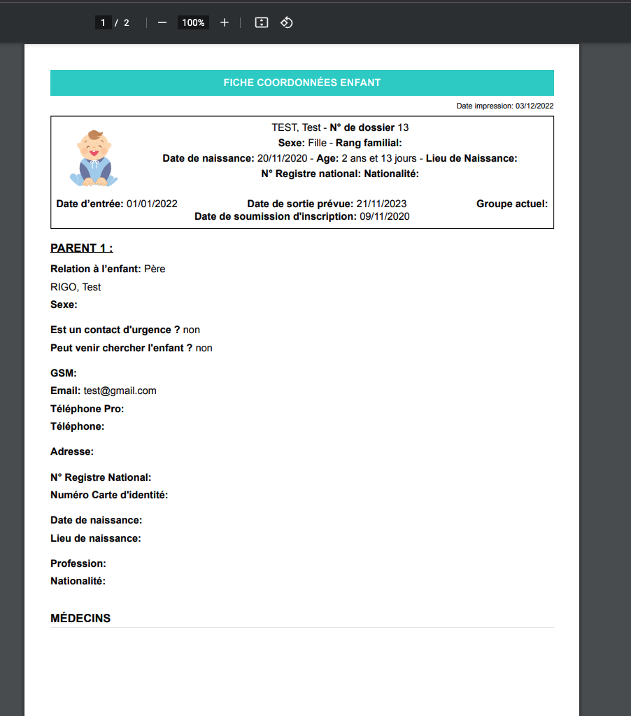 Une autre option disponible à tout moment est la génération d’un PDF imprimable contenant toutes les informations de l’enfant et des parents.