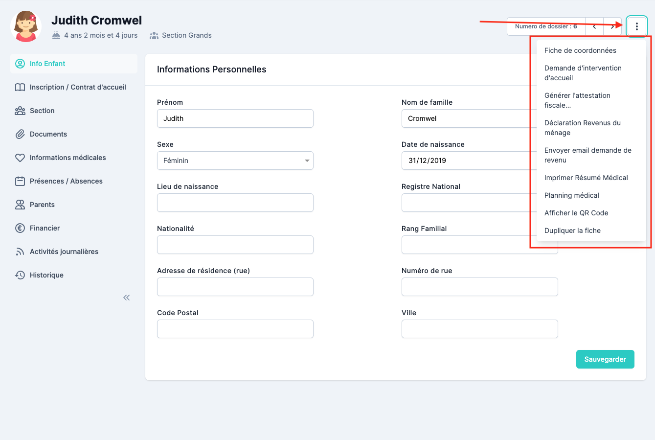 Le petit menu de la fiche enfant, qui se trouve tout en haut à droite de chaque fiche enfant, vous offre quelques fonctionnalités bien pratiques.