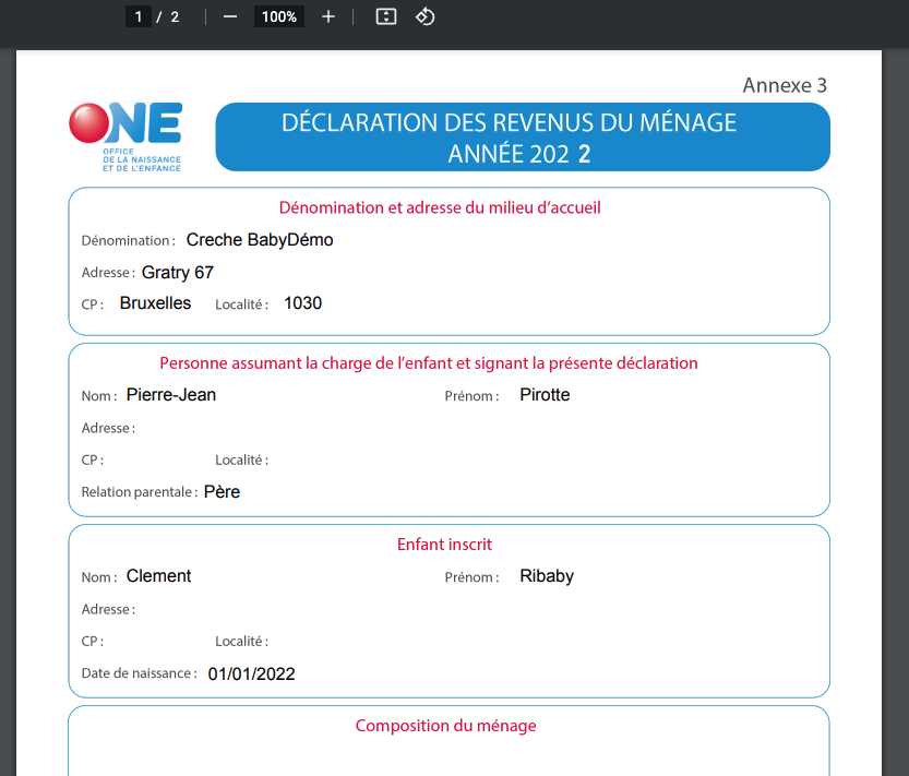 Génère le document “Déclaration des revenus du ménage” pour cet enfant. Le document généré peut être imprimé directement.