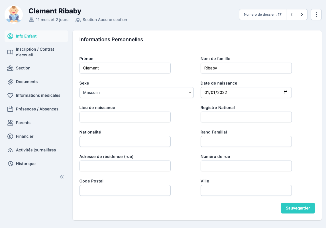 La fiche de l’enfant est accessible depuis la liste des enfants, simplement en cliquant sur l’un d’entre eux.
