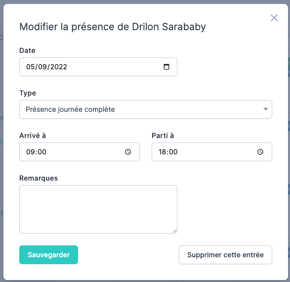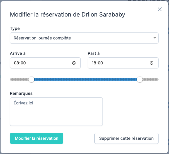 Il est possible de supprimer la réservation, ce qui va dès lors libérer une place dans le calcul des disponibilités. Cliquer sur une présence ou absence va permettre de modifier celle ci et éventuellement d’en modifier le type :