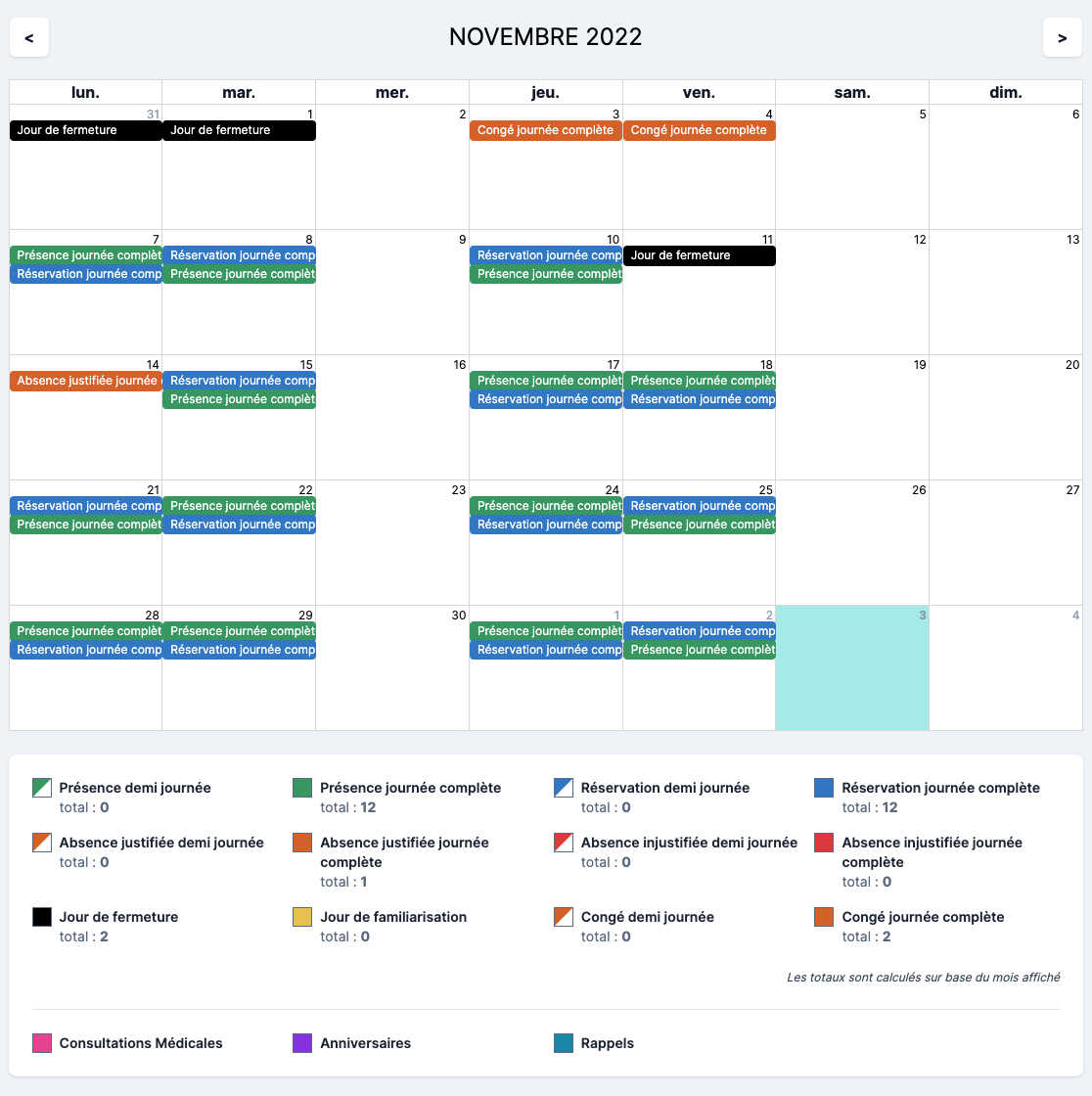 S’y trouvent également : anniversaire, consultations médicales, rappels et le total par mois de chaque type de présence / absence. Cliquer sur une réservation va permettre de modifier les informations de la réservation.