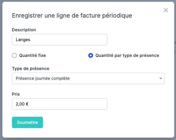 En choisissant la quantité par "type de présence", vous devrez choisir quel type de présence vous souhaitez compter. Si vous choisissez "Présence journée complète" par exemple, avec un prix de 2€, et que vous avez encodé 7 présences, vous verrez sur la facture du mois une ligne comme ceci: