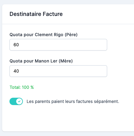 Pour chacun des parents vous devrez indiquer le pourcentage qu’ils devront payer par rapport au total de la facture. Le total des pourcentages doit toujours valoir 100%.
