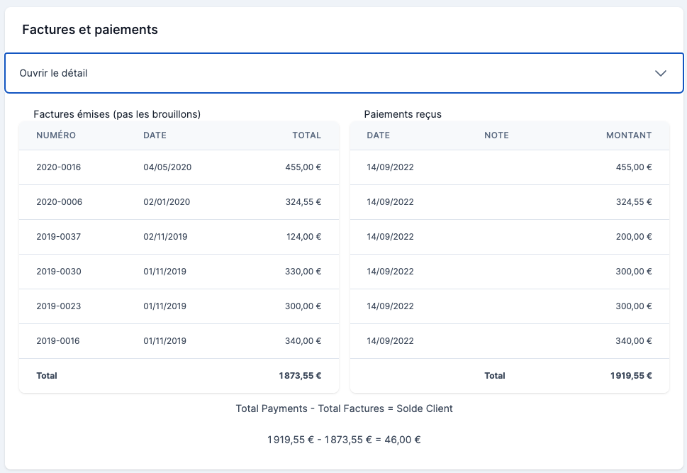 Ici vous trouverez deux listes situées côte à côte, toutes les factures liées à l’enfant et tous les paiements reçus. Cela vous fournit un détail du calcul du solde client.