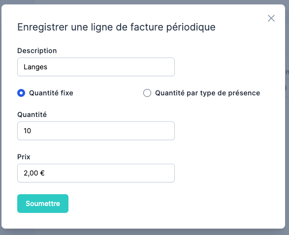 Ce module permet d’ajouter automatiquement, sur chaque facture générée mensuellement, une ou plusieurs ligne(s) supplémentaire(s). Ceci peut être utilisé pour, par exemple, facturer des langes ou des repas, que ce soit en forfait fixe ou en fonction du nombre de présences.