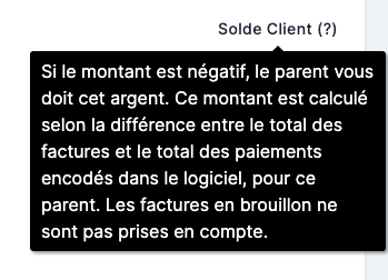 Sur la droite de cet encadré se trouve le Solde Client, il s’agit de la différence entre le total de toutes les factures émises pour l’enfant, et le total de tous les paiements reçus.