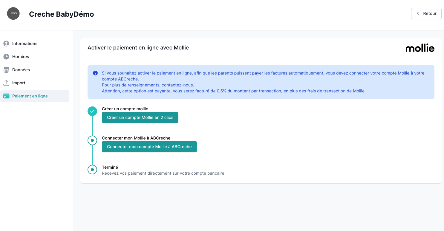 Cette fonctionnalité est disponible uniquement pour les crèches ayant un compte Mollie.
