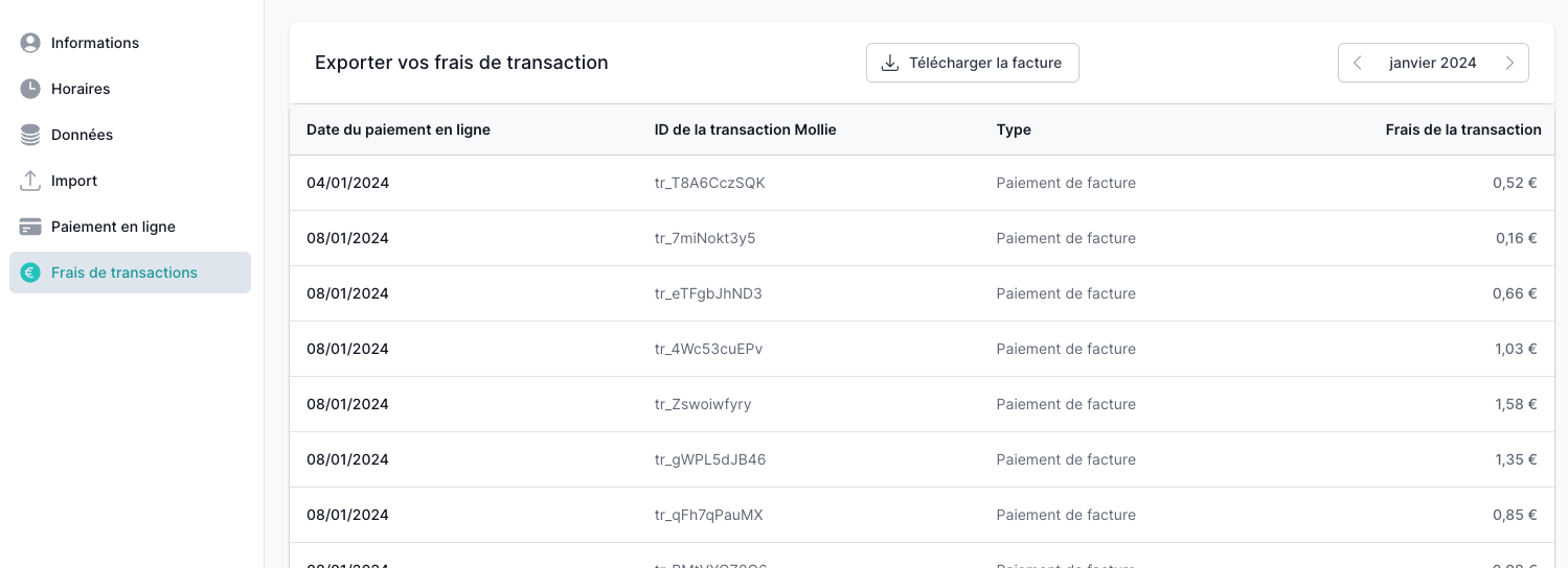 Les montants payés par les parents sont versés sur votre compte Mollie. Dans votre portail Mollie, vous trouverez toutes les transactions effectuées par les parents, ainsi que les montants qui vous sont dus.